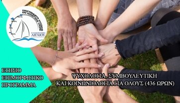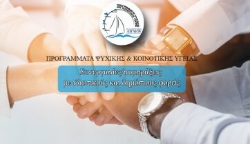 Τα Προγράμματα Ψυχικής και Κοινοτικής Υγείας του Πανεπιστημίου Αιγαίου στα πλαίσια των ερευνητικών, επιμορφωτικών και κοινωνικών δράσεων τους σε κάθε γωνιά της Ελλάδας και της Κύπρου αναζητούν συμπράξεις με ιδιωτικούς και δημόσιους φορείς, σχολεία, εταιρείες, συλλόγους, ΑΜΚΕ και ΜΚΟ, επιστημονικά ιδρύματα, ΚΕΚ, ΙΕΚ και σωματεία κλπ, που μπορούν να παρέχουν εκπαίδευση στα γνωστικά αντικείμενα της Ψυχολογίας, της Συμβουλευτικής, της Διαπολιτισμικής, Περιβαλλοντικής, Ειδικής και Γενικής Εκπαίδευσης, της Μουσειακής Αγωγής, της Πολιτισμικής Διαχείρισης, του Coaching, του NLP, των Ειδικών Θεραπειών, του Τουρισμού, των Οικονομικών και ευρύτερα των κοινωνικών και ανθρωπιστικών επιστημών.